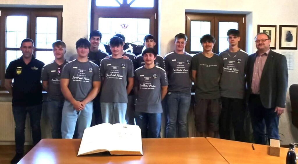 Der 1. Bürgermeister Uwe König hat im Namen der Marktgemeinde Freihung am 11. April 2024 zur Sportlerehrung ins Rathaus eingeladen. Mit dabei war auch die U19 der JFG Haidenaab-Vils. Die Mannschaft um die beiden Trainer Niklas Kohl und Noah Kohl erreichte in der Saison 2023 die Meisterschaft in der Qualifikationsgruppe Mitte Amberg/Weiden und konnte somit den Aufstieg in die Kreisklasse-Süd feiern. Das beachtliche Ergebnis in Zahlen: 8 Spiele – 7 Siege – 1 Unentschieden – 0 Niederlagen; 22 Punkte; Torverhältnis 24:6!