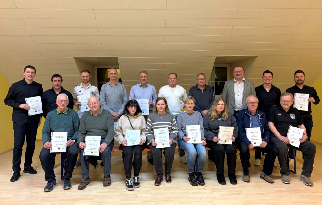Aus dem detaillierten Bericht des Abteilungsleiters Tischtennis Werner Apfelbacher ging hervor, dass die vergangene Saison erneut ziemlich durchwachsen verlief. Gleiches gelte für die laufende Spielzeit. Die Damenmannschaft belegte den 6. Platz in der Bezirksklasse-A. Gemischte Gefühle gab es bei den Herrenvertretungen. So schaffte die Mannschaft Herren-3 als Vizemeister den Aufstieg in die Bezirksklasse-D, die 2. Herrenmannschaft erreichte den 3. Platz. Anders gestaltete es sich bei der 1. Herrenmannschaft, welche nach einer recht verkorksten Saison mit einigen Ausfällen leider auf dem letzten Tabellenplatz landete. Glücklicherweise durften sie dennoch in der Liga verbleiben und rangieren zurzeit auf Platz 6. Sehr erfreulich ist, dass aufgrund des derzeitigen Zuspruchs eine weitere, vierte Herrenmannschaft angemeldet wird. Die tolle Nachwuchsarbeit, federführend organisiert von Christian Lautenschlager und unterstützt durch Birgid Baldauf und Werner Apfelbacher, trägt erste Früchte: Es konnte nach 10 Jahren Abstinenz zum Saisonstart 2025/26 eine neu formierte Jugendmannschaft zum Spielbetrieb gemeldet werden. Nach dem Motto „aller Anfang ist schwer“ müssen die jungen Spieler erstmal Turnierluft schnuppern und Erfahrungen sammeln. Bei der Saisonabschlussfeier wurden besonders langjährig aktive Tischtennisspieler mit der BTTV-Leistungsnadel sowie einer Abteilungsehrung ausgezeichnet. Hervorzuheben ist in diesem Zuge Georg Tafelmeier, der als letztes aktives Gründungsmitglied für all seine Verdienste rund um die Tischtennissparte zum „Ehrenspielführer“ ernannt wurde.